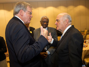 Ed Hatrick, superintendent, Loudoun County Public Schools, left, speaks with Steven Knapp, GW president, right, at the Chamber's Leadership Luncheon April 18. Jim W. Dyke, Jr., senior advisor, state govt. relations, McGuire Woods Consulting, in the background. Photo Credit: © 2013 David Galen.
