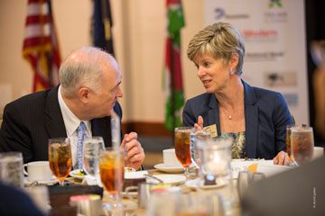 GW president Steven Knapp, left, speaks with Tracey White, chairman of the board, Loudoun County Chamber of Commerce and vice president for community & govt. relations, Reston Hospital Center, right, at the Chamber's Leadership Luncheon April 18. Photo Credit: © 2013 David Galen.