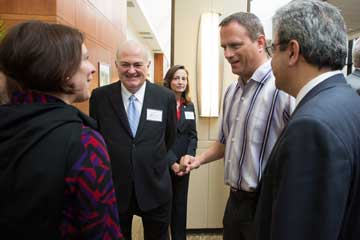 From left to right: Joanne Theurich, chief administrative officer, HHMI Janelia Farm Research Campus, speaks with GW President Steven Knapp and John Wood, ceo and chairman of the board, Telos, both members of the advisory council for GW's Virginia Science & Technology Campus (VSTC) and Ali Eskandarian, Dean, GW VSTC. Photo Credit: William Atkins.