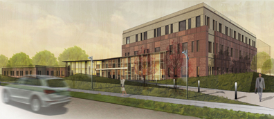 Concept rendering, east view, of the new building under construction at the GW Virginia Science & Technology Campus in Ashburn, Va.